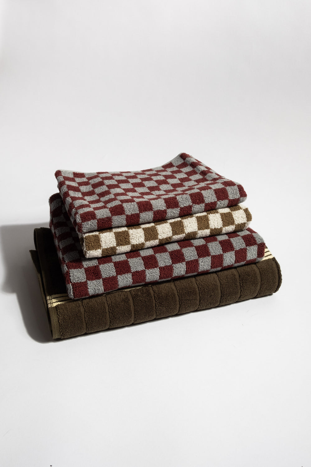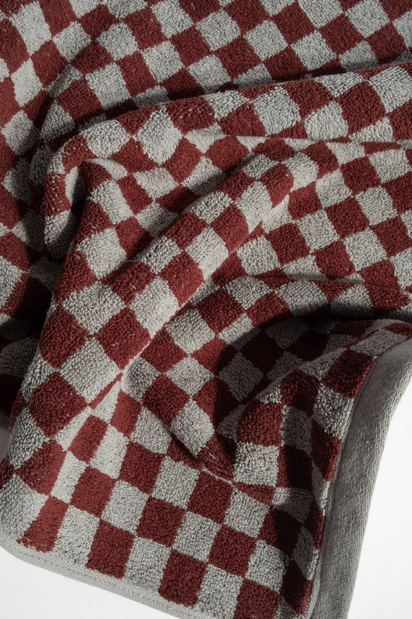 Luxuriously soft hand towel in a playful checkerboard print, woven of a high pile, double loop, organic cotton terry and features a reversible colorway from side to side. Makes for a welcome and colorful distribution in any bathroom.